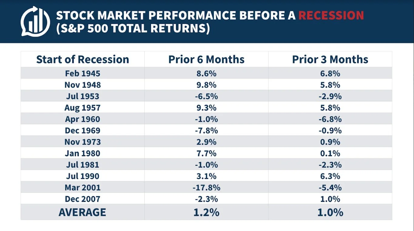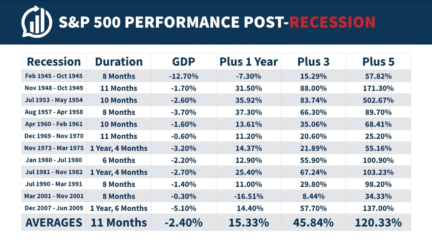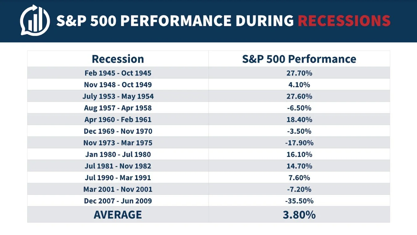 We investors should not have an excessive fear of recessions. Believe it or not, they are a normal component of the business cycle and are unavoidable. Did you know that since the Great Depression of 1929, recessions have occurred in a consistent cycle every 4-5 years on average? They have been referenced as a sort of "pitstop," a time to make adjustments and new assessments during an ever growing and changing economy. It has even created opportunity by providing lower stock prices and weeding out short term speculators. But by the time the recession is over, long term investors who stayed the course will ultimately be the ones who are aligned to reap the benefits of the recovery. Notice below the historical returns before a recession, during a recession, and the recovery years after: